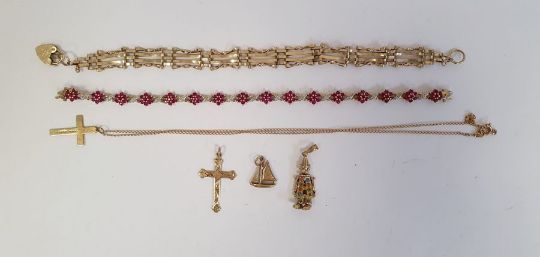 9ct gold gate-link bracelet with padlock clasp, 6.5g approx., 9ct gold cross on chain, 1.5g, a 9ct gold pendant cross engraved detail, 1g approx., a 9ct gold toy pendant, multi-gem set, 2g approx., a gold coloured sailing boat pendant and a 9ct gold ruby and diamond set bracelet, 9g approx. in total