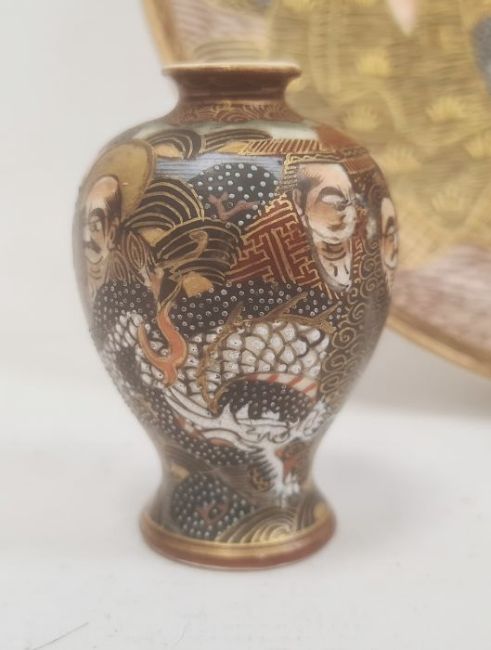Japanese Satsuma plate decorated with seated figures and a dragon, 21cm diameter and a small Japanese Satsuma vase painted with multiple figures and dragon, 6.5cm high (2)