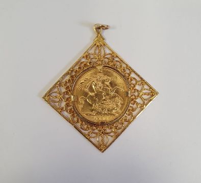 1966 gold sovereign mounted in a yellow metal pendant, diamond shapedCondition ReportTotal Weight Approx. 13g