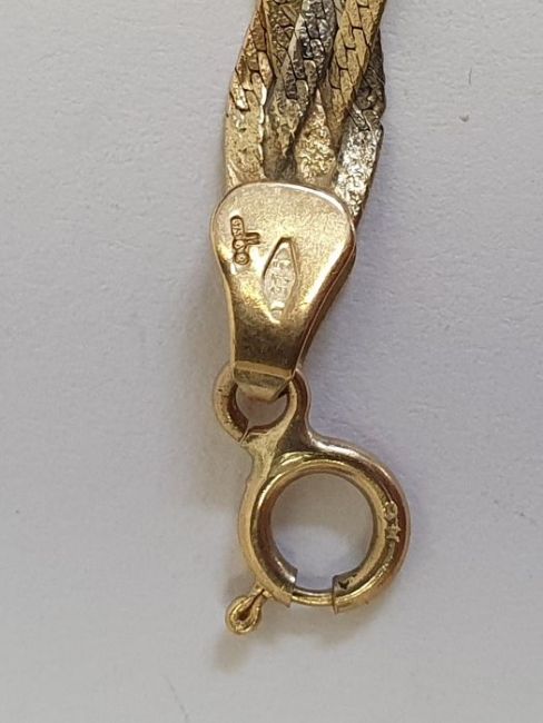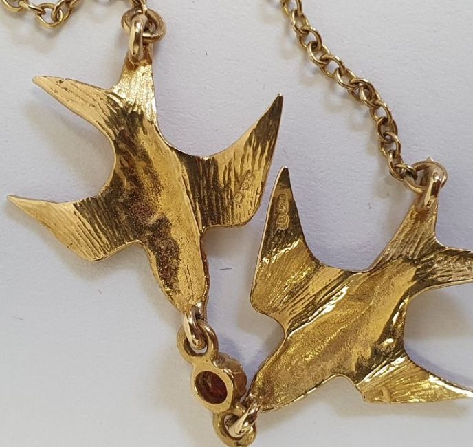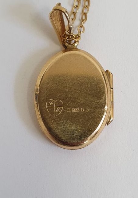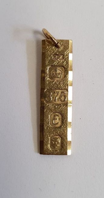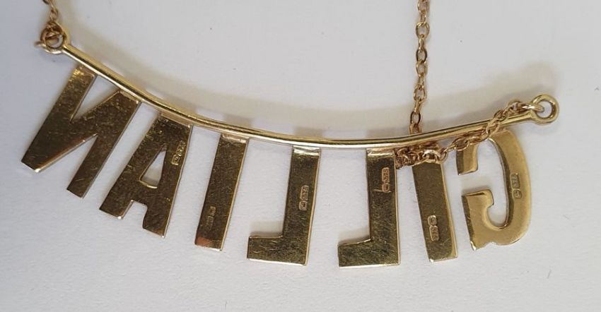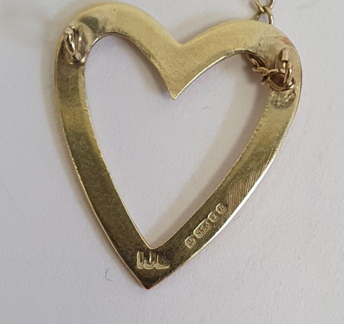 9ct gold flat chain-link bracelet, 2g approx., a 9ct gold ingot pendant, 2g approx., a 9ct gold locket on chain, 2.5g, a 9ct gold pendant on chain "Gillian", 3g, 9ct gold pendant on chain set with two birds, 3g, a broken 9ct gold heart shaped pendant on chain, 2g approx., 9ct gold chain, 1.5g, a fine gold chain (unmarked) and a broken piece of chain