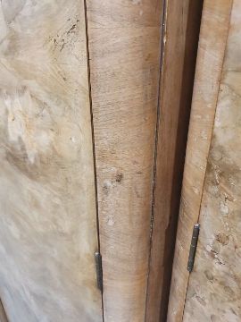 Three piece 20th century walnut bedroom suite comprising two wardrobes and a dressing table in the Art Deco style, bakelite handlesCondition ReportSurface scratches, scuffs. Areas of loss and some splits to the veneer. the handle of one drawer is broken as is a couple of the escutcheons. Areas of fading, discolouration and staining.Dresser excl mirror  H 76cm x W 112cm x Depth 60cmWardrobe H 155cm x W 89cm x D 46cmLarge wardrobe H 194cm x W 123cm x D 55cm