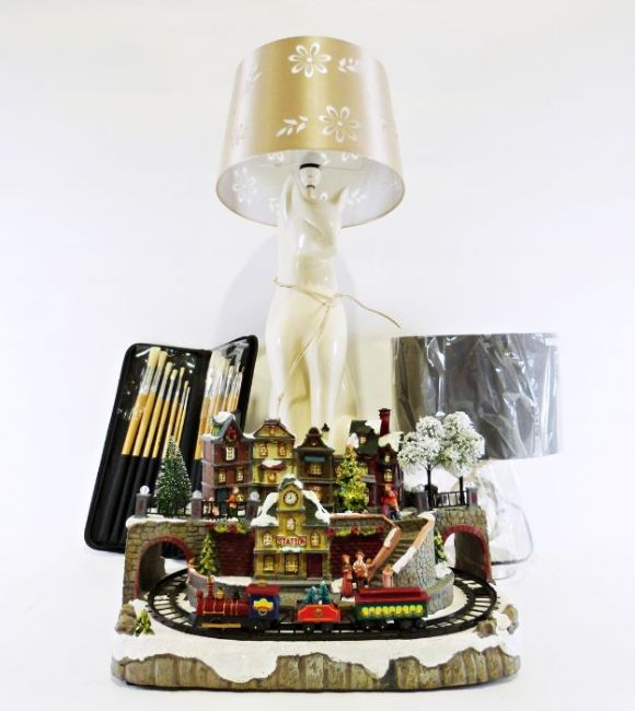 Modern table lamp in the form of a cat, a Christmas village model and a further modern table lamp (3)