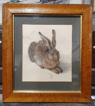 Study of a hare together with various other prints and paintings
