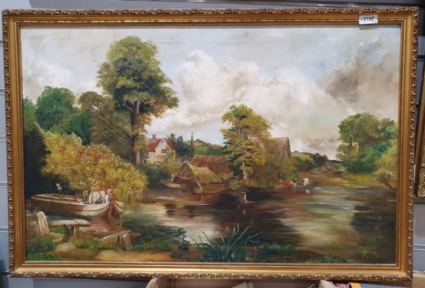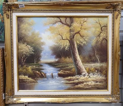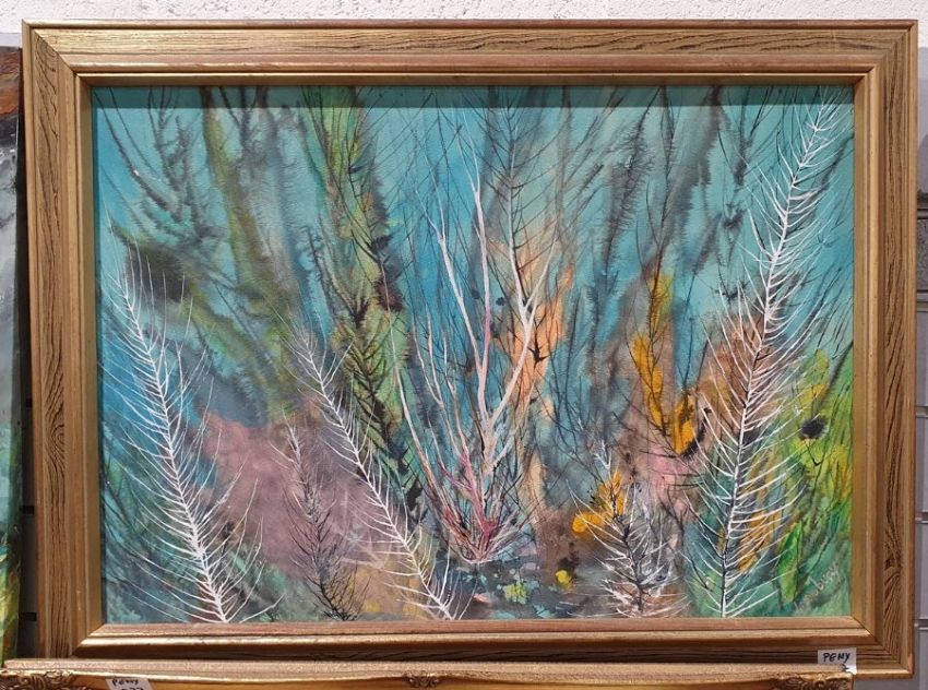 Oil on canvas of a river scene, monogrammed and dated '84 lower right, Lounsbury abstract ink study of trees together with an oil on canvas of a river scene, indistinctly signed lower right (3)