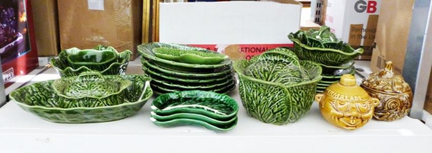 Group of John Buck serving items and plates in the form of lettuce leaves, a Sylvac lidded chutney pot and a Sylvac marmalade pot