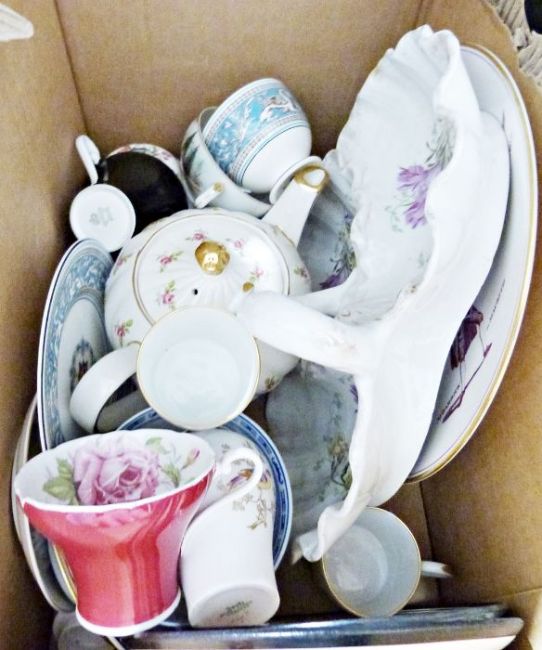 Two Aynsley teacups, a Wedgwood cup and saucervarious further china ware and various dolls (3 boxes)
