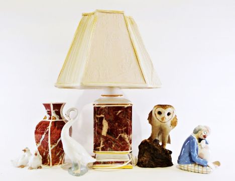 Nao model of a swan, two Nao models of ducklings, a sculpture of an owl, a modern ceramic table lamp, a vase and a sleeping clown figure