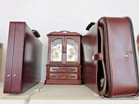 Various collector's plates by Royal Albert and Royal Doulton, five cameras, a leather brief case and further household items
