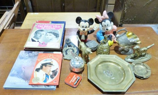 Two Chinese-style figures table lamps, metalwares, books on Royalty, etc
