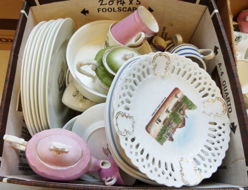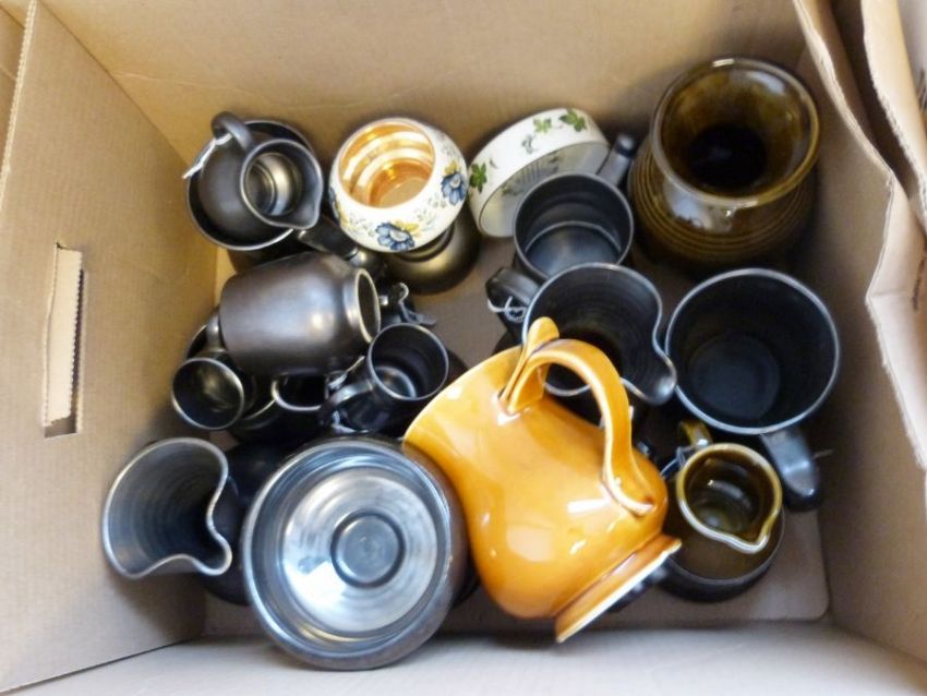 Collection of Prinknash pottery jugs and tankards, a Wedgwood 'Glen Mist' part dinner / tea service designed by Susie Cooper together with further items of china (5 boxes)