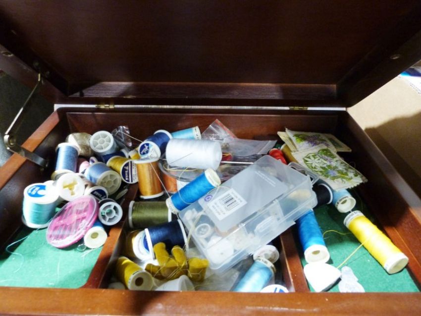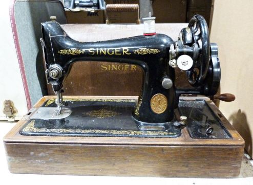 Vintage Singer sewing machine together with a sewing seat and contents of cotton reels, etc (2)