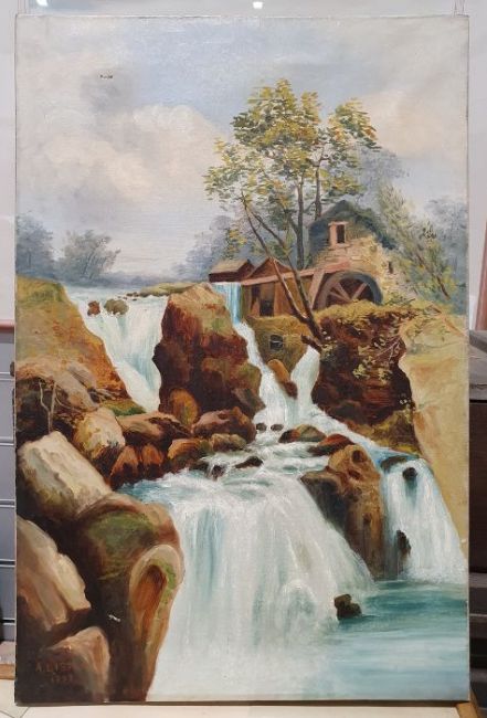 River scene with mill, and various other prints and paintings (7)