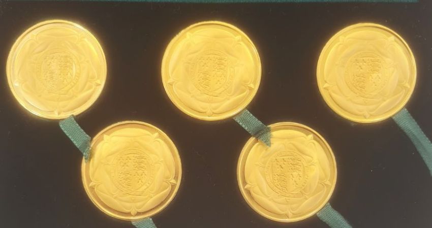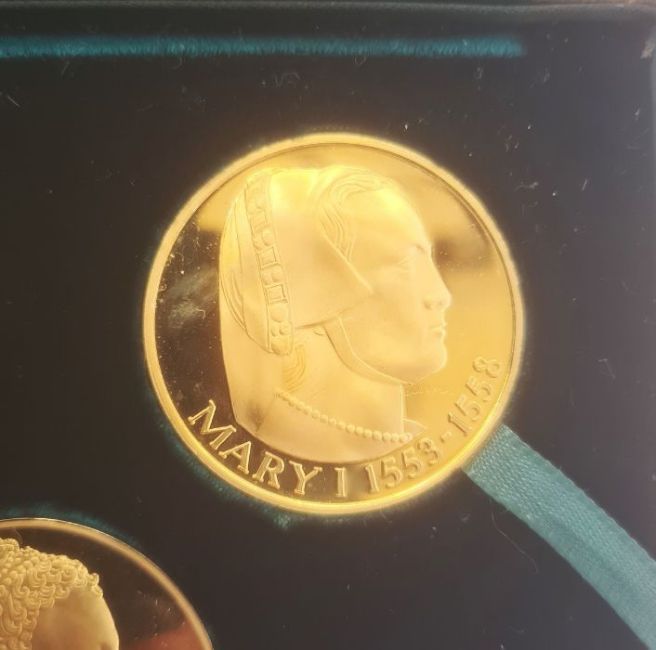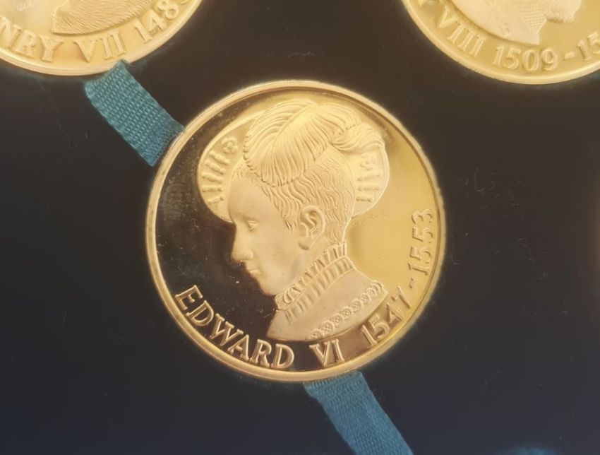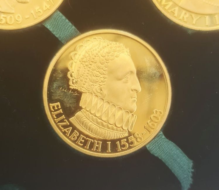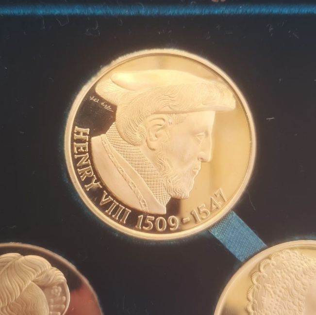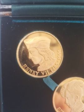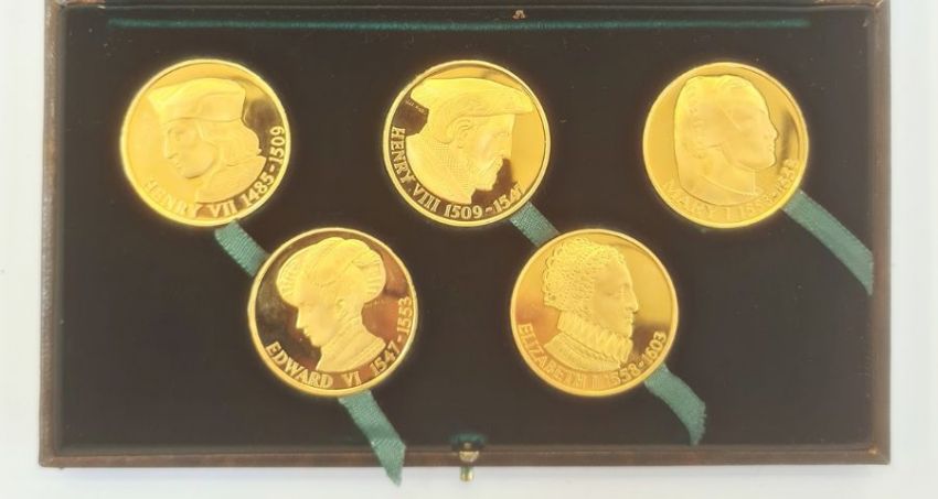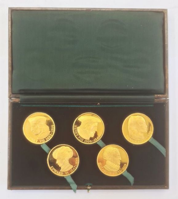 Gold 22ct medallions of Kings and Queens of Tudor England, set of 5, hallmarked for Birmingham 1971 combined weight 159g