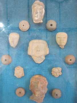 South American/Aztec stone vase fragments and masks in glass case, 36.5cm x 23.5cmCondition ReportPlease see additional photos