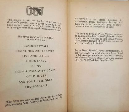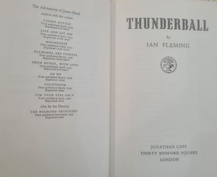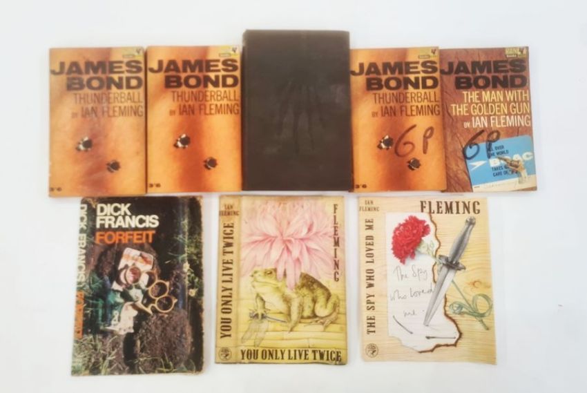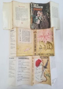 Fleming Ian " Thunderball"  Jonathan Cape  1961, black cloth with blind stamped skeleton hand, no -d-j, Pan Edition " Thunderball" 1963 , three copies, one with loss the backstrip, " The Man with "The Man with the Golden Gun" Second Printing 1967, dust jackets only for " You Only Live Twice", not price clipped, " The Spy Who Loved Me" with price label, corner clipped, and  d-j only for " Forfeit" by Dick Francis  (8)