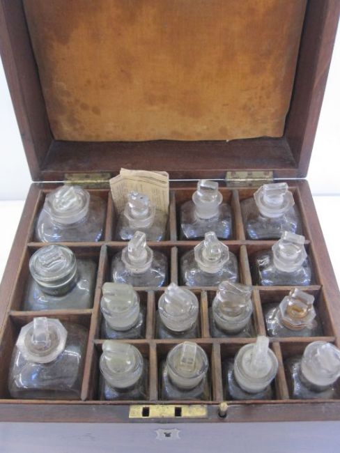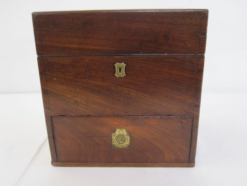 19th century mahogany cased apothecary chest with hinged lid enclosing various fitted glass bottles, single drawer enclosing scales, pestle and mortar, ceramic jars, etc, with brass carry handles, 26cm wide x 27.5cm high