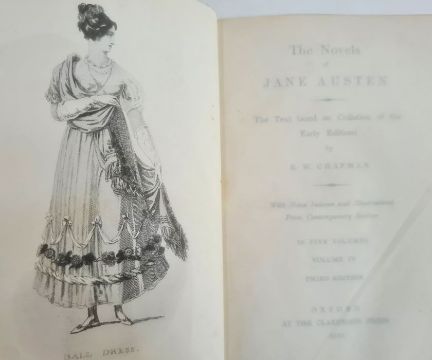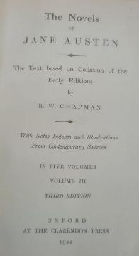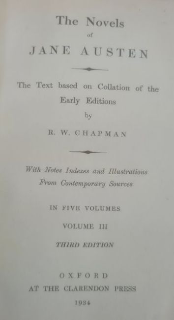 Austen, Jane"The Novels of Jane Austen - the Text Based on Collation of the Early Editions by R W Chapman in five volumes", 3rd edition, Oxford at the Clarendon Press 1933"Sense and Sensibility", "Pride and Prejudice", "Mansfield Park", "Emma", "Northanger Abbey" and "Persuasion", five vols, half-green calf, green boards, t.e.g., corners bumped, boards with some possible damp (5)
