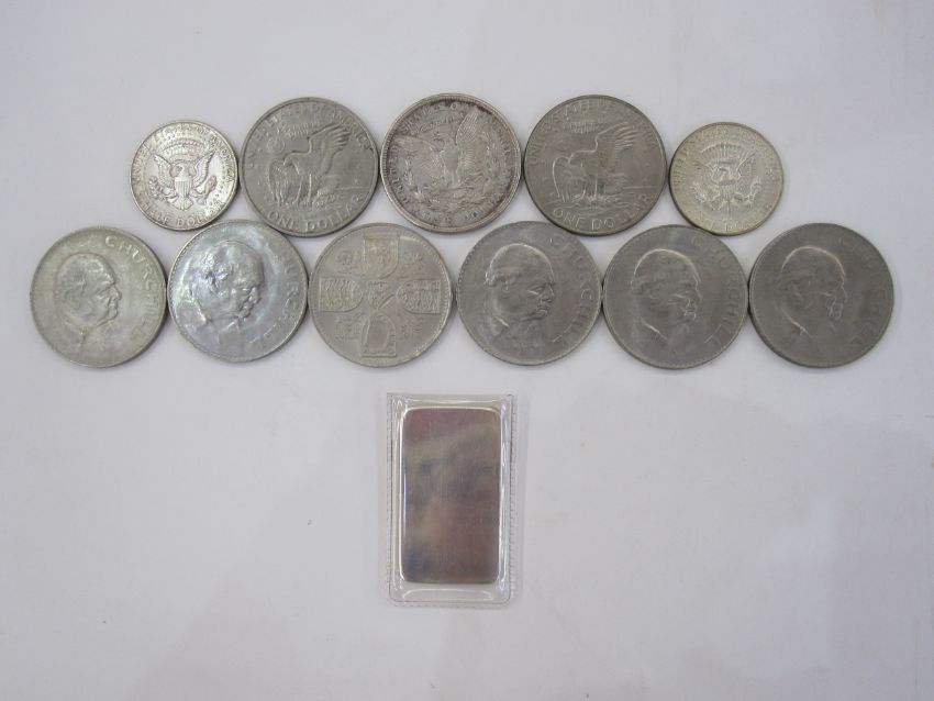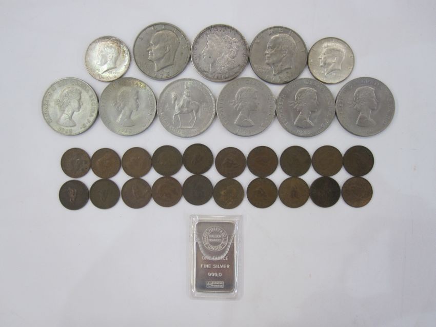 1921 US dollar, 2 x 1972 dollar, 1964 and 1965 half dollars, 6 British commemorative crowns, quantity of copper farthings and a 1oz fine silver ingot, cased