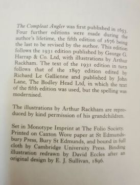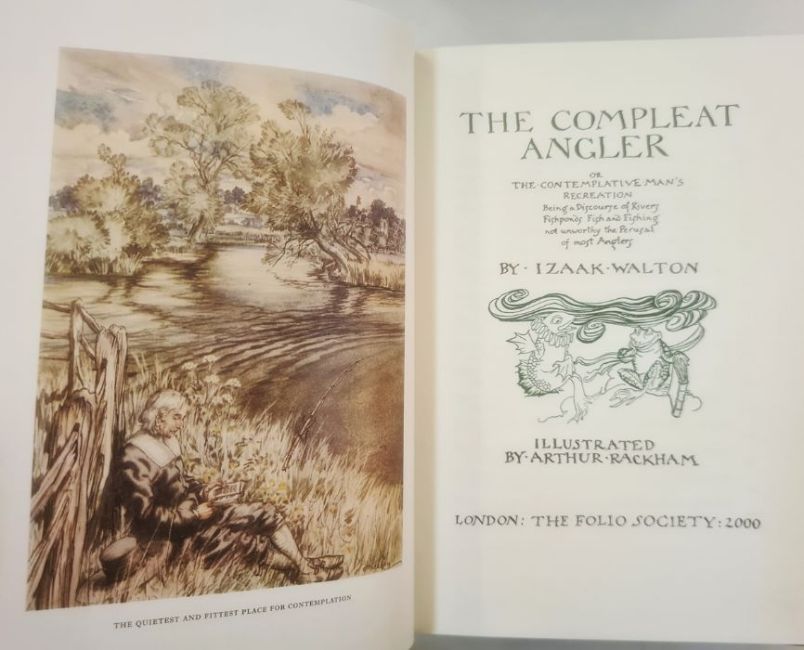 Fishing interest Sanderman, Fraser "By Hook by By Crook", Henry Sotheran & Co 1892, colour plates, photographic frontis, vignette on tp, marbled ep, rebacked with original pastedown title to backstripHutton, J Arthur"Rod - Fishing for Salmon on the Wye ...", The Fishing Gazette 1920, photographic illustrations, biro inscription dated 1957 on ffepScott, Jock "Spinning Up To Date, Trout, Salmon and Pike", 2nd edition, Sealey Service & Co, n.d., colour frontis, photographic plates and drawings, green cloth, dj but rather chipped"Grease Line Fishing for Salmon", 5th edition, djSullivan, Edmund J (ills)"The Compleat Angler by Izaak Walton", JM Dent 1896, speckled edges, illustrations, pictorial clothMajor, John (ed)"The Complete Angler ...", London privately printed for the Navarr Society Ltd 1925, frontis portrait with tissue guard, plates with tissue guards, illustrations, pictorial green cloth and gilt titlesFolio society"The Compleat Angler by Izaak Walton" (8)