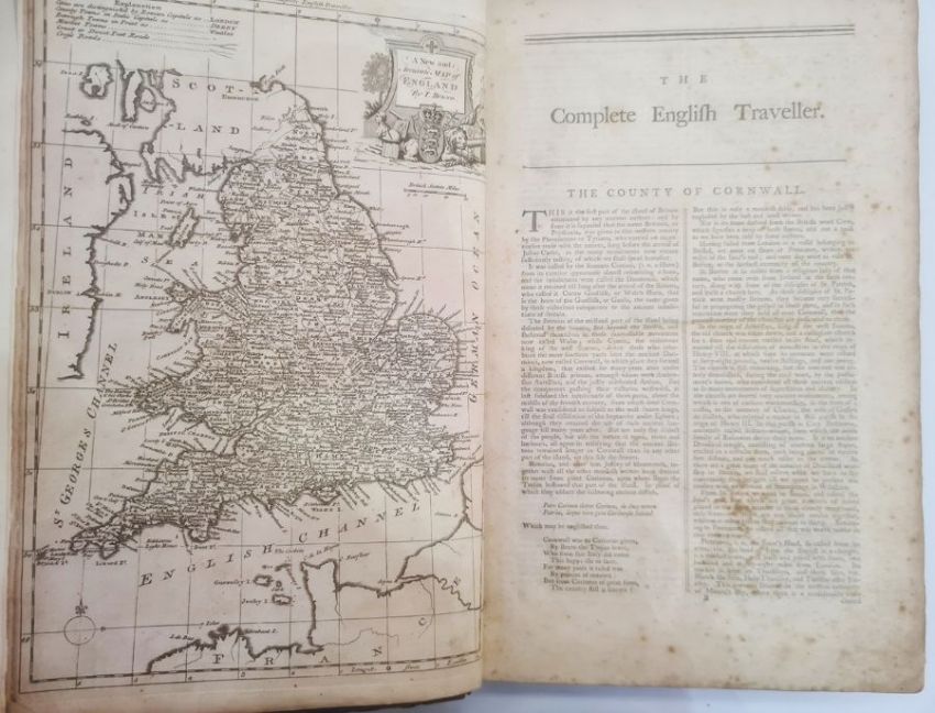 Spencer, Nathaniel "The Complete English Traveller; or a new survey and description of England and Wales ... to which is added a concise and accurate description of that part of Great Britain called Scotland ...", London printed for J Cooke at Shakespeare's Head 1771, engraved frontis piece, tp and introduction pages are cut down (see image), foxed, map of England facing chapter one, plates throughout (not collated), rebacked with contemporary leather laid down on boards, raised bands with gilt rules and red morocco pastedown with titles