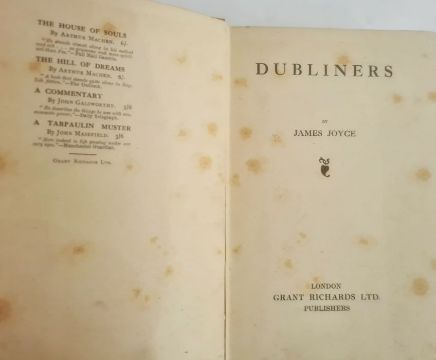 Joyce, James"Dubliners", Grant Richards Ltd Publishers 1914, printed by The Riverside Press Ltd, foxing to initial pages, half title, ep, back hinge cracked, corners bumped particularly bottom right hand corner of the front board, gilt titles to front board and backstrip