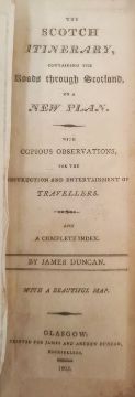 Duncan, James"The Scotch Itinerary containing the roads through Scotland on a new plan ... and a complete index", Glasgow, James and Andrew Duncan Booksellers 1805, frontis folding map, 1st edition, table of heights and two-page booksellers catalogue, rebacked in plain calf with blind rules, contemporary full tree calf laid down, red morocco pastedown with gilt titles to upper cover, speckled edges, 20cm x 8cm Condition Report.