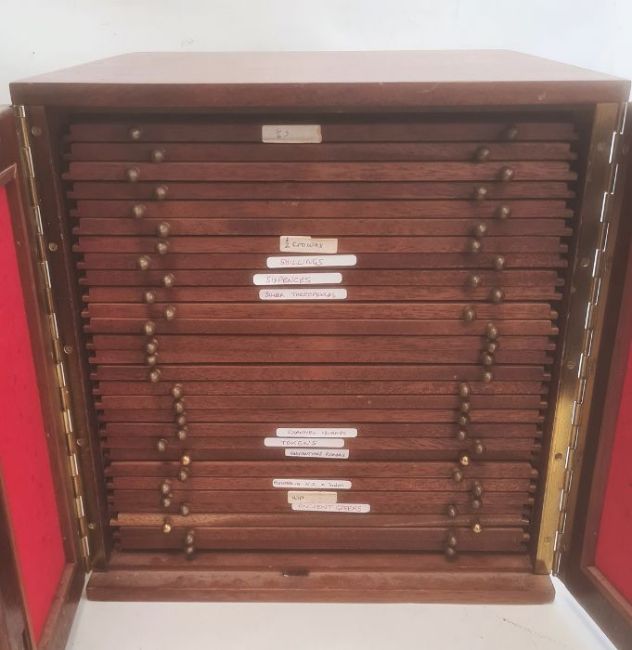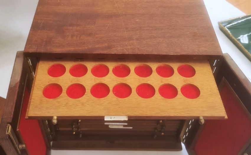 Mahogany coin cabinet with 28 trays, velvet inlaid, with later added brass lock