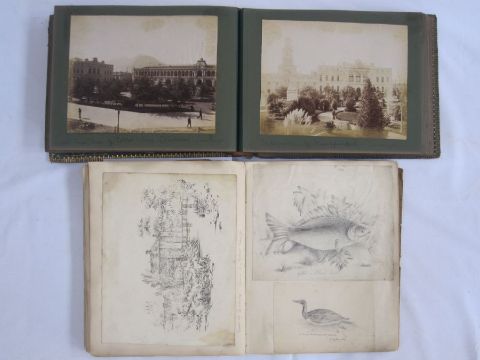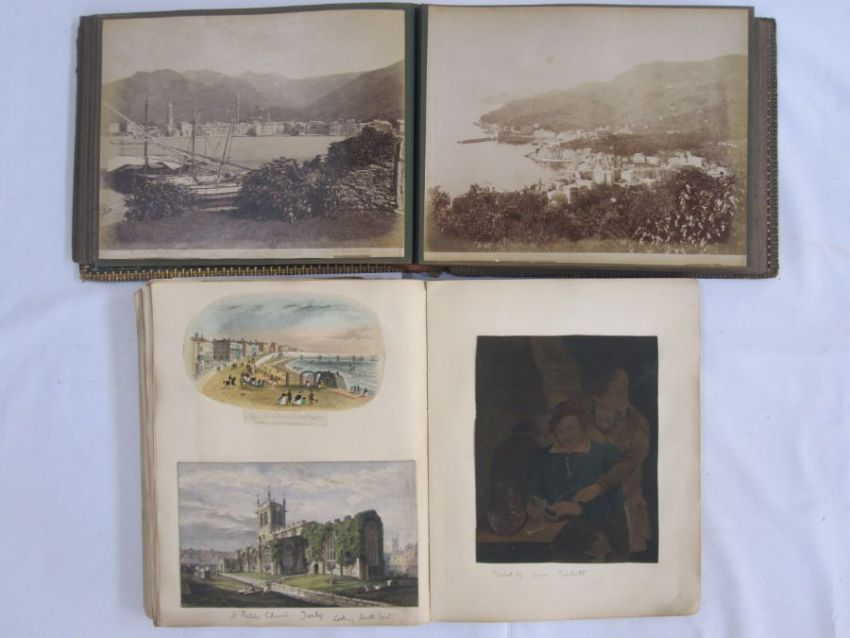 Late 19th/early 20th century scrapbook containing drawings, cut-outs, greetings cards, prints, landscape drawings on various studies, etc and a scrap album of photographic prints to include 'Menton-Pont St-Louis', 'San Remo', 'Genova', 'Santiago', 'Rio' (2)