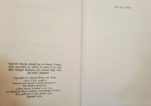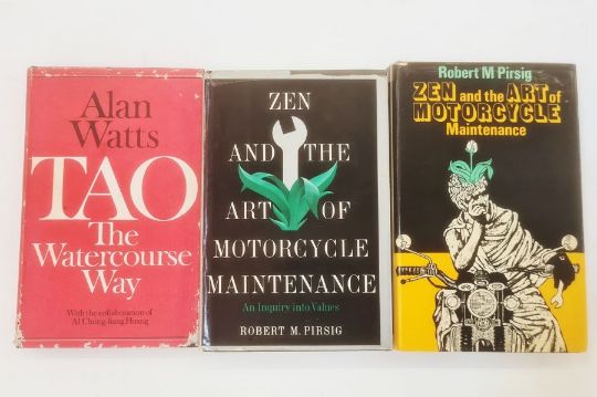 Pirsig, Robert M"Zen and the Art of the Motorcyle", The Bodley Head, first published 1974, reprinted 1974, bkpl taken from ffep, ink name and date 1976, brown cloth, dj not price clipped and another copy, William Morrow & Co, New York 1974, grey cloth with black backstrip, dj not price clipped but has some loss at the topWatts, Alan"Tao The Watercourse Way", Jonathan Cape 1976, black cloth, dj not price clipped but some wear (3)