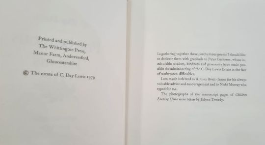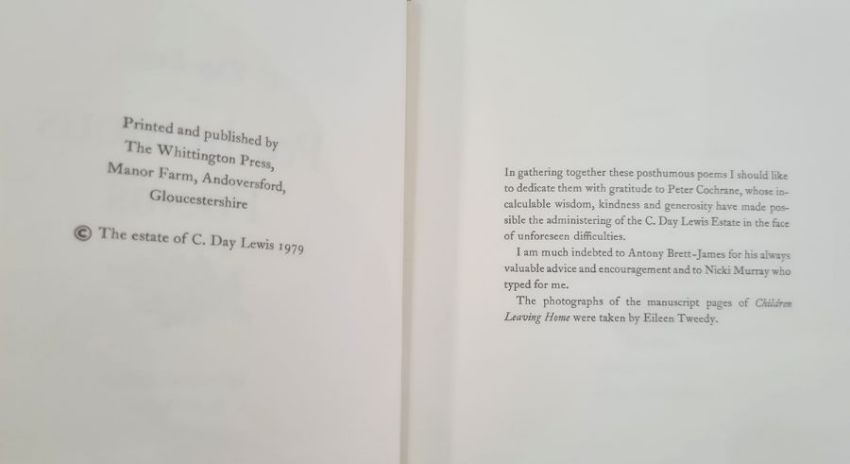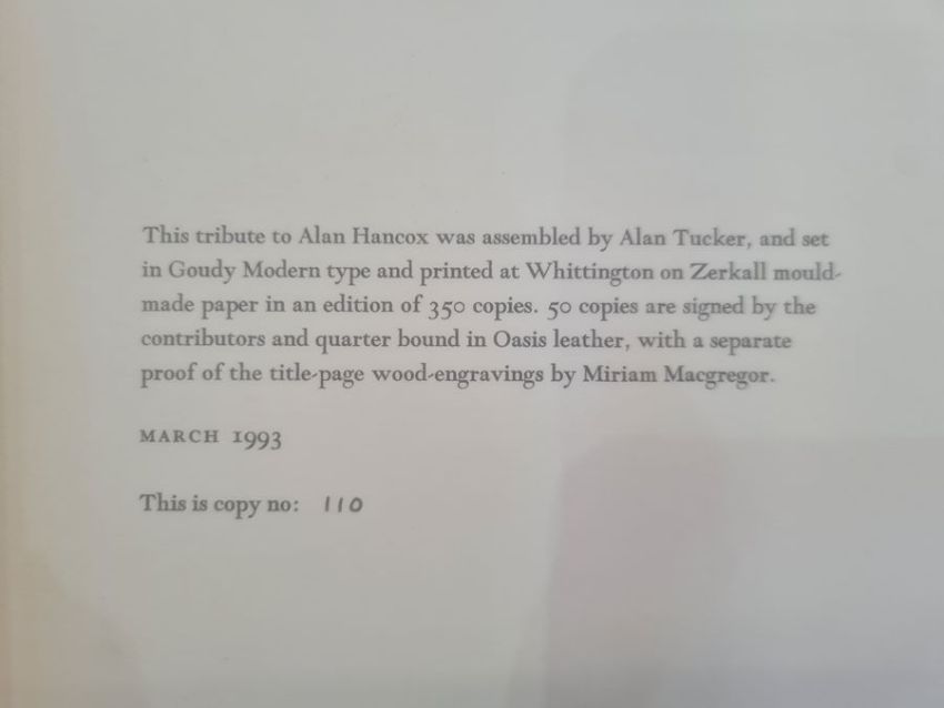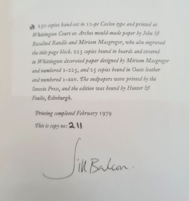 Whittington Press "Whittington; memories of a Cotswold Village by Frank Berry", photographic portrait frontis tipped in, published 1982, frontis portrait is of the author with his parents and sister in 1909, this is copy 158 of 350 copies set in 12 point monotype Caslon printed at Whittington Court on Glastonbury laid paper and is bound by Smith Settle & Co printed completed May 1982, signed by the author 'Frank Berry', photographic illustrations tipped into text, pictorial ep - a bird's view of Whittington about 1910, boards of wild strawberries, quarter cloth with pastedown title to backstrip, no slip jacket - (not issued)"Poems for Alan Hancox... Melvyn Bragg, D J Enright, Michael Foote, Michael Horovitz, etc", published by The Whittington Press 1993, this tribute to Alan Hancox was assembled by Alan Tucker and set in Goudy modern type and printed at Whittington on Zerkall mould-made paper, an edition of 350 copies, this is number 110, maroon ep, patterned boards, no slip case, (not issued)C D Lewis"Posthumous Poems", with an introduction by Jill Balcon, The Whittington Press 1979, this is number 211 of 250 copies hand set in 12-Pt Kaslon type at printed at Whittington Court on Arches mould-made paper by John and Rosalind Randall and Miriam Macgregor who also engraved the tp block, 250 copies bound in boards and covered in Whittington decorated paper designed by Miriam Macgregor numbered 1-225, ep printed by Senecio Press and the edition bound by Hunter & Foulis, Edinburgh, printing completed February 79, this is copy number 211 signed by Gill Borkan, with slip case (3)