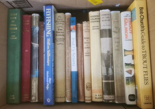 Fishing interest to include:-Hartman, Robert "About Fishing"Scott, Jock "Greased Line Fishing"Goddard, John"Trout Fly Recognition"Skuse"Minor Tactics of the Chalk Stream"Lonsdale Library"Fishing" and other titles (2 boxes)