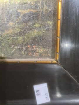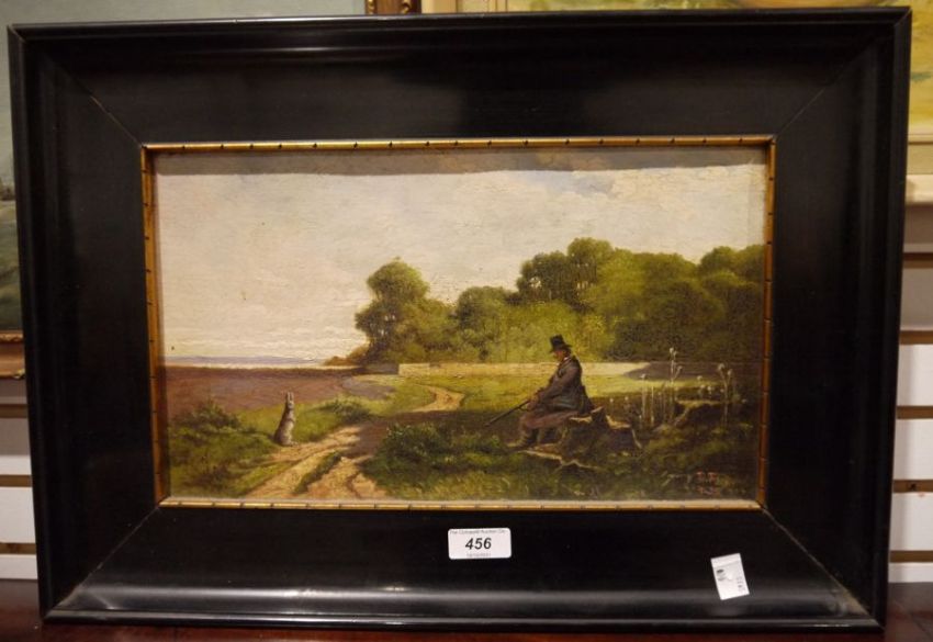 Early 20th century schoolOil on boardFigure with gun seated and facing hare, signed indistinctly lower right 'R.Fix Cop' and dated 1924, 20cm x 34cm