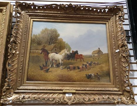 John Frederick Herring Junior (1815-1907)Oil on board Farmyard scene with animals, signed lower left and printed mount to margin 41 x 52 cm