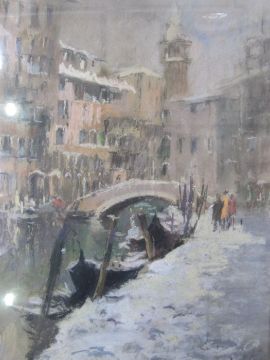 John Ambrose (1931-2010)Pastel drawingVenetian scene with view of canal and St Mark's tower in background, 38.5cm x 28cm