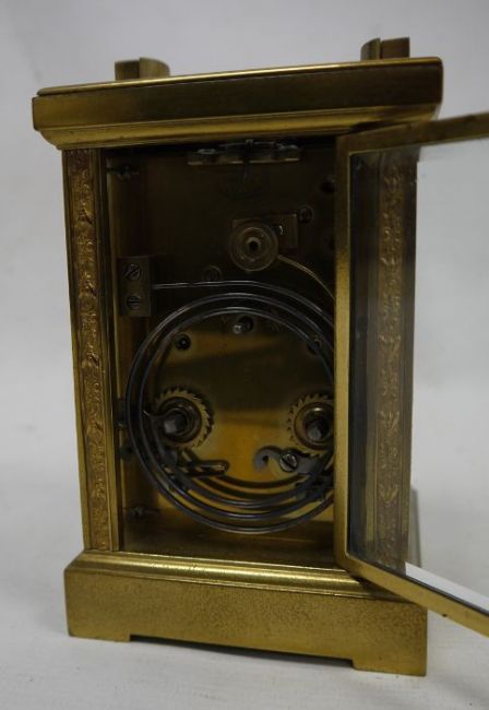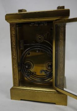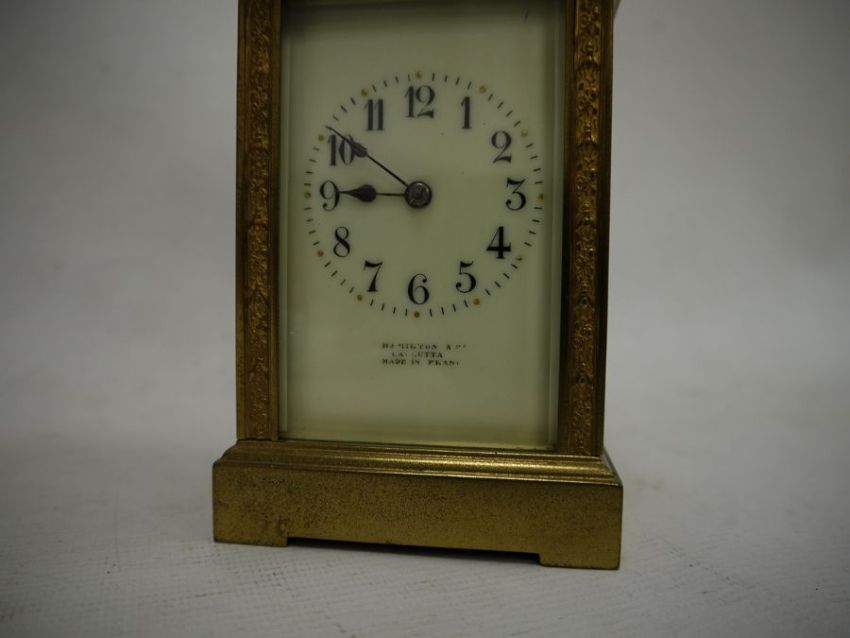 Late 19th century glass and brass carriage clock with Arabic numerals to the dial, marked 'Hamilton & Co, Calcutta, Made in France', with inscription to top 'presented to Sergt Sutton by The Members of A Troop Behar Light Horse, April 11th 1898'