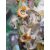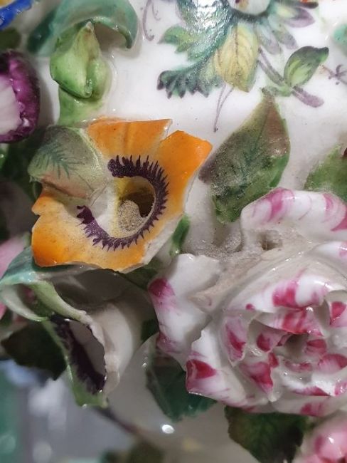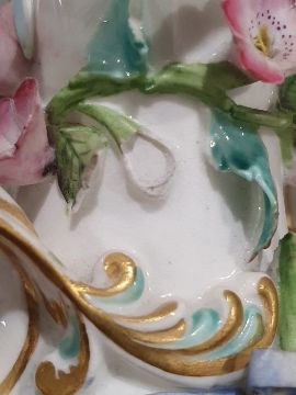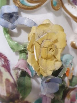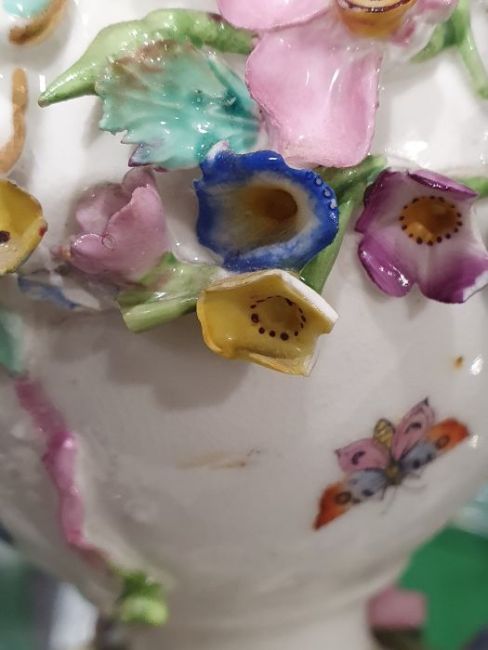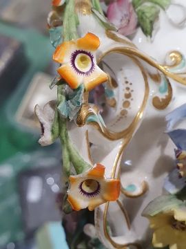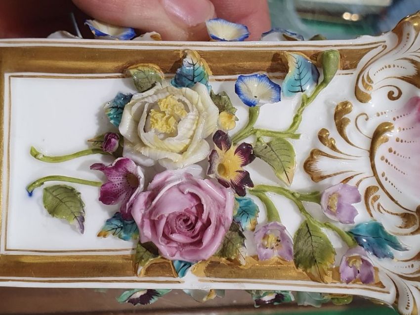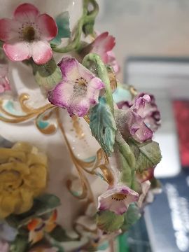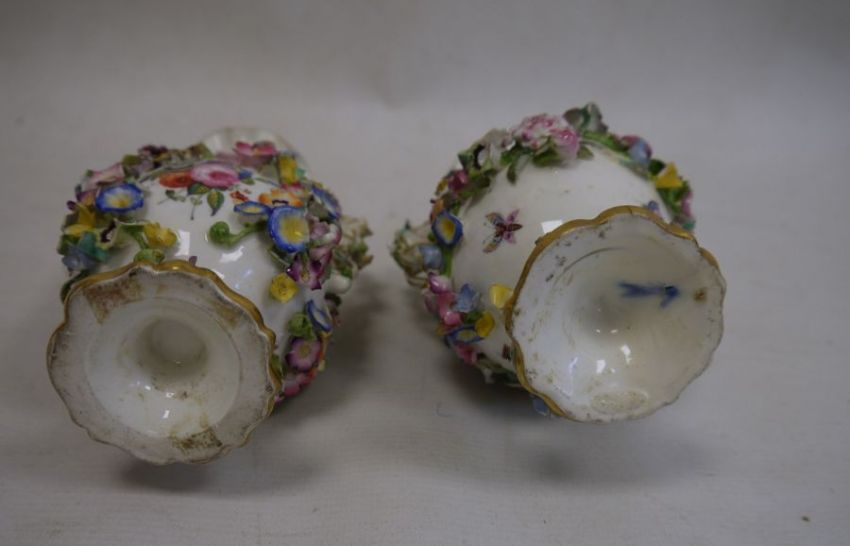 Pair of 19th century china floral encrusted vases, baluster-shaped with scrolled and looped handled, decorated with floral sprays and landscapes with ruins, all encrusted with flowers and gilt highlights, 16cm high, a pair of 19th century china floral encrusted vases, each rectangular, the four sides encrusted with floral sprays, gilt borders, stepped plinth base, 11.5cm high and a continental porcelain gilt metal mounted jewel casket, rectangular, having domed porcelain panels, floral painted to a pale yellow ground with white jewelled borders, gilt metal foliate scroll supports, 14cm wide (5) Condition ReportNumerous areas of loss to the flowers and leaves on all vases.  Possible restoration to the foot of one vase, wear to the gilt and light crazing to all.
