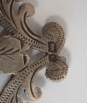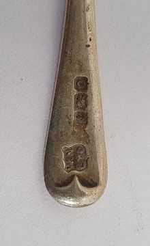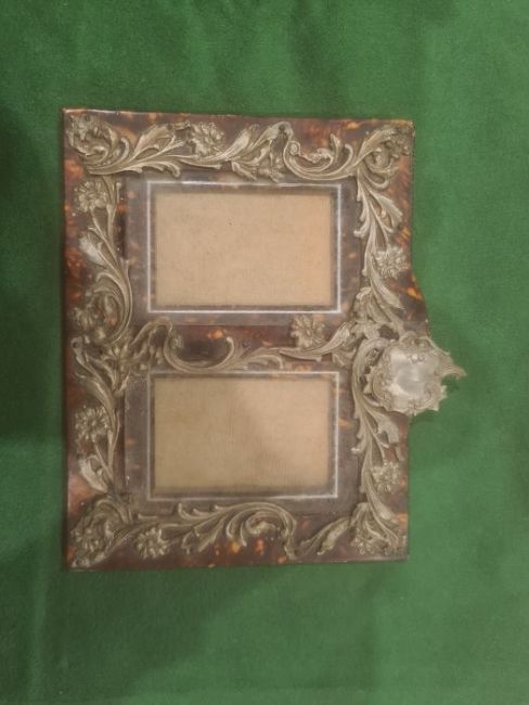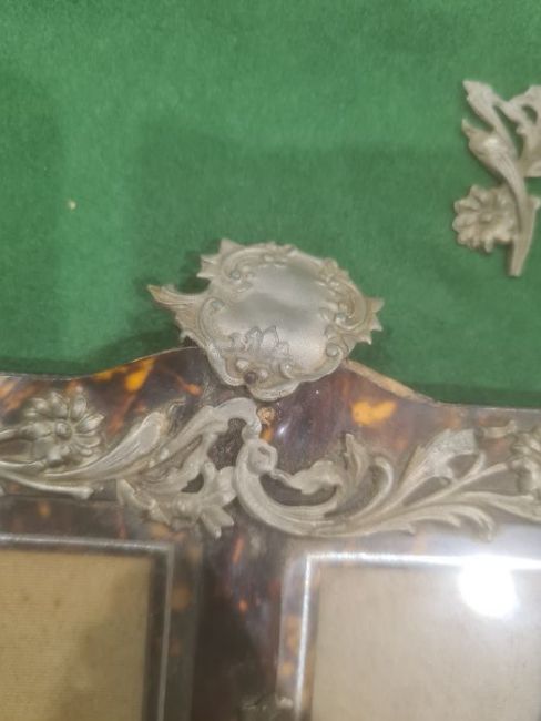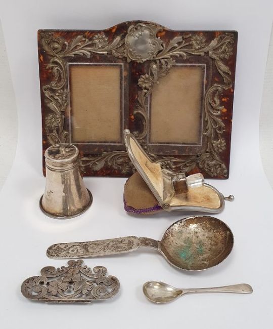 Victorian silver-mounted and glass scent bottle in suede case, Birmingham, marks worn, a tortoiseshell and silver-coloured metal mounted photograph frame, a pair of rectangular panels surrounded by a single frame, foliate scroll decorated, 12.3cm x 15cm approx., a silver measure '1.PR.Snert', marked 380S to base, a miniature silver spoon, half a silver-coloured metal buckle and a spoon (6) Condition ReportSilver coloured metal frame- The frame doesn't have any hall marks. A section of the pattern has broken loose in the centre as well as a piece on the top that is only attached by a nail. There looks to be small bits of damage to the metal elsewhere. The back of the frame has writing scratched into it. There also some wear to the back especially around the locks. See attached images.