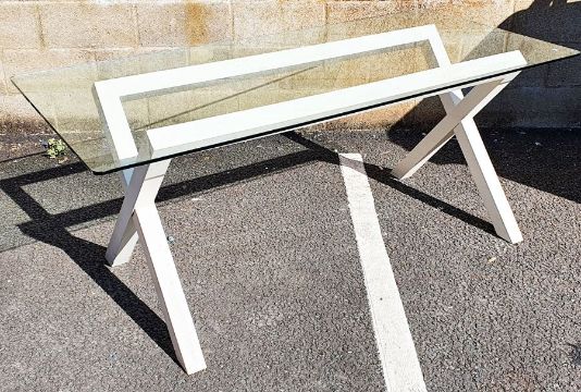 Modern glass-topped dining table, rectangular with white painted X-shaped base, 175cm x 82cm