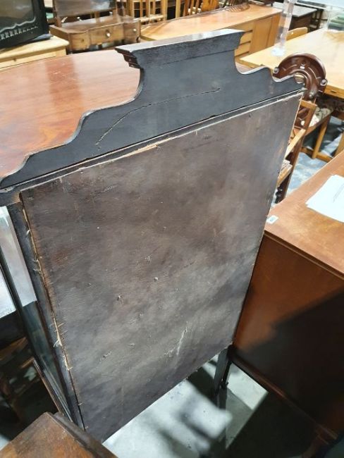 Early 20th century mahogany and boxwood strung bowfront display cabinet with leaded glazed doors enclosing shelves, on square section supports, spade feet, 62cm x 144cmCondition ReportSome surface scratches and scuffs to the wood, one of the glass panes is cracked, fading and discolouration to interior material, general wear and tear.  Door opens and closes properly and there is a key