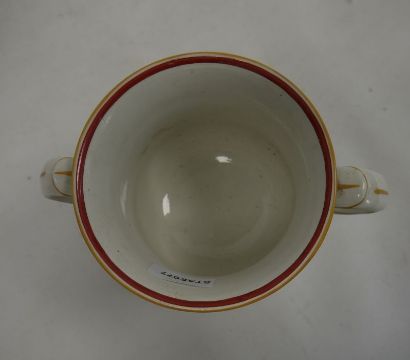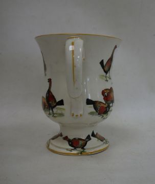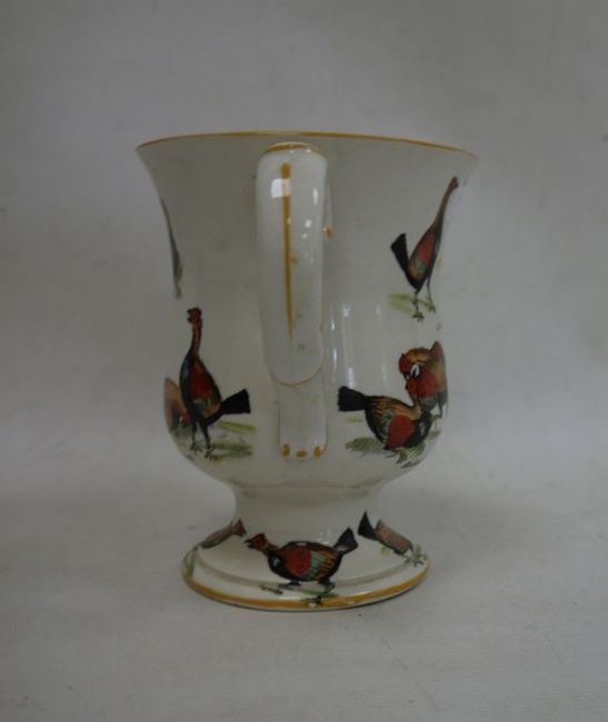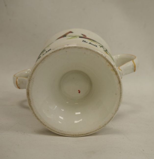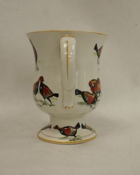 Ceramic two-handled trophy cup decorated with fighting birds 'A Challenge', 'A Knock Down Blow', etc, 17cm high