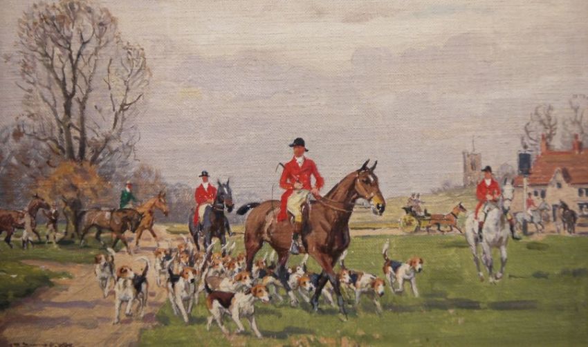 John Sanderson Wells (1872-1955)Pair oils on boardHunting scenes, Huntsmen and hounds on village green, signed lower left, 16cm x 25cm and 17cm x 25cm (2)