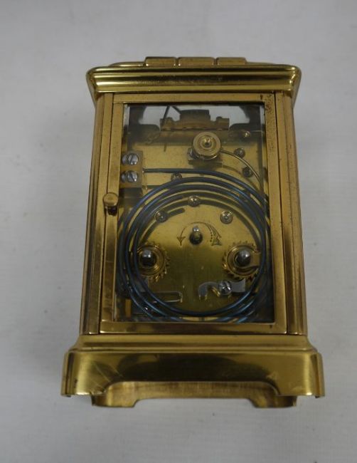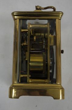 Brass and glass carriage clock with Roman numerals to the dial, in leather carry case
