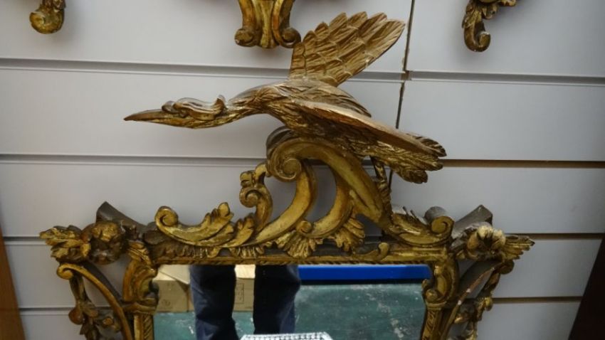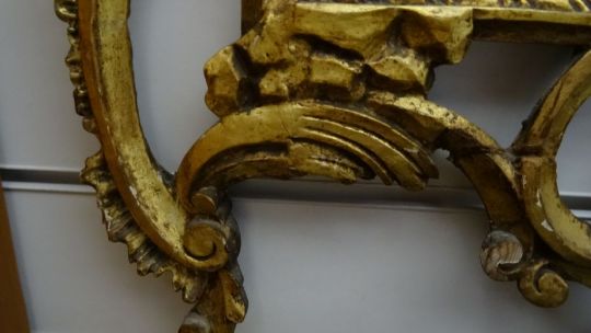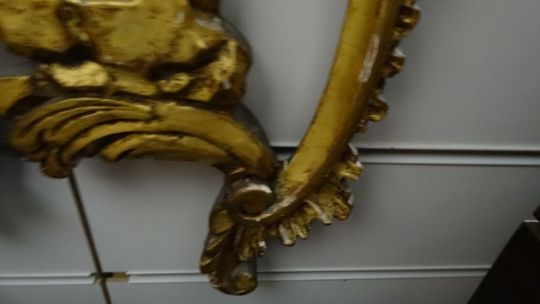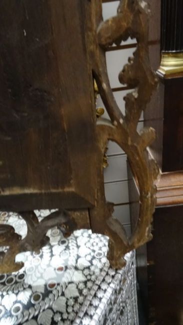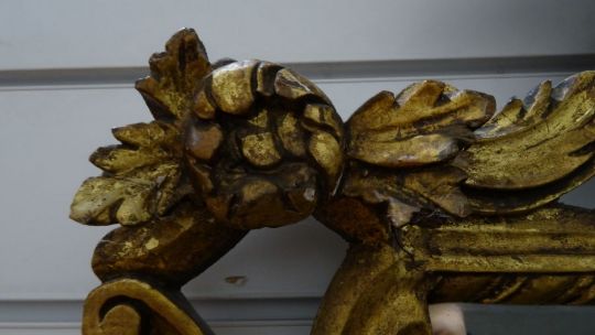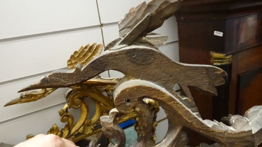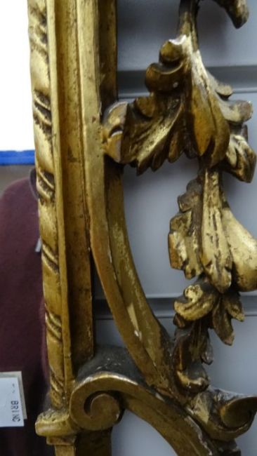 Pair giltwood wall mirrors of eighteenth century chinoiserie style, each surmounted by ho-ho bird and applied C-scrolls and flowers, 94cm high (2) Condition ReportWe believe that these could be period; but are sticking to the description of 18th century style. To both mirrors; cracks, splits, losses, chips etc throughout. Signs of repairs to both mirrors, especially to one of the birds. Backs are probably later. One mirror with damage to the silvering of glass bottom right corner. Both mirrors in need of attention, and both very worn, and general wear and tear throughout. Please see attached photographs, but please view in person to satisfy yourself of the condition.