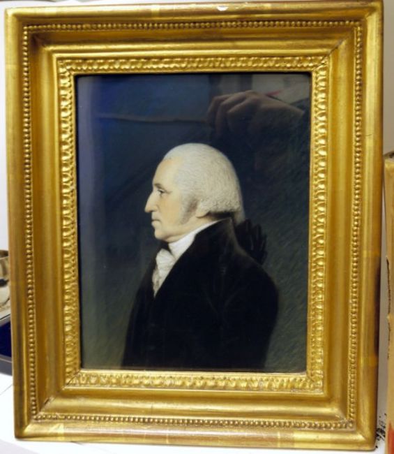 James Sharples (1751-1811) Pastel drawingHead and shoulders portrait of George Washington (1796-1801), in profile, 23cm x 18cm Provenance: this picture was formerly at Bowden Hall in Upton St Leonards, near Gloucester, and has remained in the family collection.  It is believed that the portrait was once owned by 19th century British collector Jeffery Whitehead and was exhibited in London twice while in his possession - in 1889 in 'A Century of British Art (2nd series) from 1737 to 1837', London, Grosvenor Gallery, incorrectly attributed to John Russell.  A fragment of this catalogue is attached verso.  Then in 1891 it was exhibited in 'The Royal House of Guelph, London, the New Gallery', correctly attributed to James Sharples (known at the time as 'Sharpless'), there is a handwritten note on the reverse of the pastel dated 1889 confirming the correct attribution in this second exhibition - 'Portrait of George Washington. Sharpless was a crayon draughtsman who came to this country (America) in 1794 and made profile portraits in pastel of many provincial men.  In 1796, being in Philadelphia, Washington sat to him, and Sharpless's portrait of Washington is the best known profile likeness of the subject.  The artist made many copies of the original and sold them for $15 apiece.  Century Magazine April 1889'.  It is thought that the picture then sold in the Christie's auction of Jeffrey Whitehead's collection in London, 1915 (lot 57 for 15 guineas) and was bought by Schroeder, most likely a picture dealer.  It then found its way to the family collection in the Cotswolds.  From this same collection, and also with an American theme, earlier this year The Cotswold Auction Company sold the first African-American published book of poetry by a slave girl, Phyllis Wheatley, 1773, for £16,500. (see Books and Works on Paper Antiques Trade Gazette No.2504). Please see Neil Jeffares 'Dictionary of Pastellists' entry J.675.697.PLEASE NOTE - if you would like to bid online on this lot please contact the auctioneers beforehand for AML compliance in order to do so. Condition ReportGenerally in good condition, requiring very little or no conservation treatment. ● The pastel was in direct contact with the glass; some off-setting of pigment onto glass, however this slight tansfer has not detracted from the clarity of the drawing.● The pastel drawing was backed with cotton wool, which was stained and dirty.● The pastel paper displays some rough cut edges.● Very slightly worn corners, and a tiny edge tear in the middle of the right hand edge.● Two very small pin-prick holes – generally inperceptible.● Slight scuffing to pastel surface to the top right in the blue background.● Some fiberous fluff on the surface, detached from the cotton wool backing.● Small spot in the sitter’s hairline area – possibly flecks in the paper or slight oxidized lead white.● Other non-detracting small flecks, probably due to loose pigment transfer.● Loose fibres from the cotton wool backing are deposited on the verso. The cotton wool has formed a protective barrier, saving the portrait from becoming acidic due to direct contact with the wooden backing board.Remedial treatment carried out on 11 October: ● The portrait was carefully removed form the frame for assessment. ● Labels removed due to brittle & failing tape. ● Lables encapsulated in inert Mylar sleeves to protect them from physical damage. ● Archival double-sided tape has been added to the sleeves in order to attachment them to back of the frame as required. ● The old cotton wool backing was stained and dirty. It was removed & retained in a Mylar sleeve. ● Loose particles of dirt were removed from the surface of the portrait. ● The pastel portait was mounted onto backing card to provide a stable, protective barrier from the wooden backing board. Materials: 100% cotton acid-free museum mount board; Removeable archival mounting strips to hold the pastel to the backing, without adhesive on the verso of the drawing. N.B. these mounting strips are visible in the frame on 2 edge of the pastel. ● The inside of the frame was dusted to remove extensive loose dust. ● A thin fillet spacer mount was made to keep the drawing spaced away from the glass to avoid any further pigment transfer. Acid-free museum board was used. ● The inside of the glass has not been cleaned, so the minimal extent offset on the glass remains in evidence.