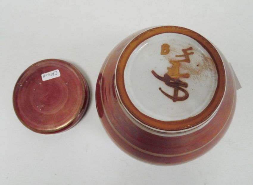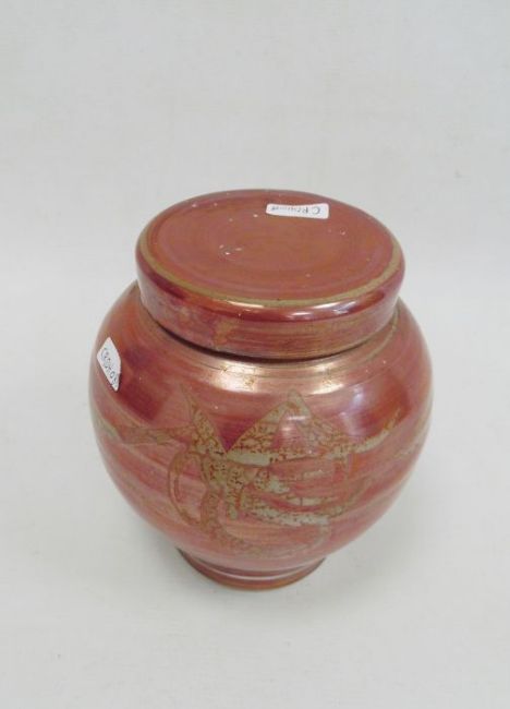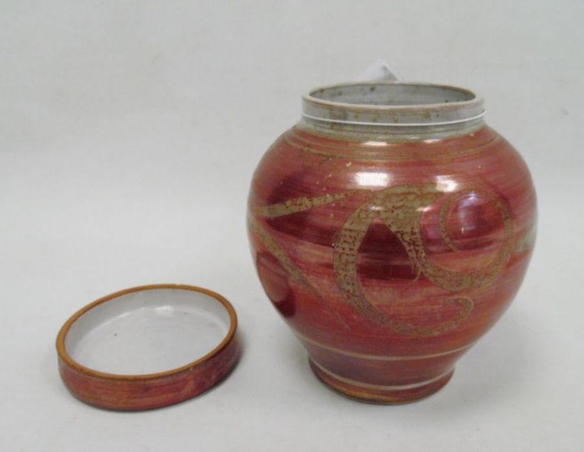 Alan Caiger-Smith (b.1930) for Aldermaston ruby lustre vase and cover, ovoid and ribbedCondition ReportWhite marks to surface (seem removable).Crazing to interior. Base wear. Chip to lid rim.Approx. 16cm Tall