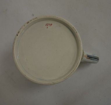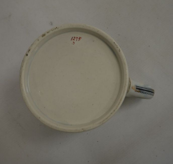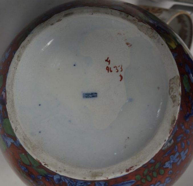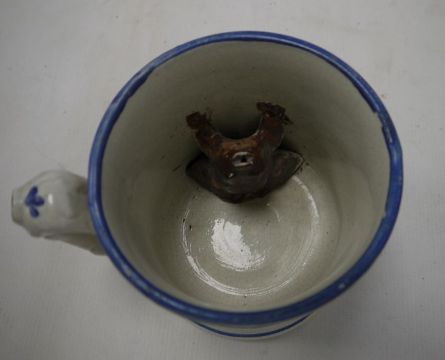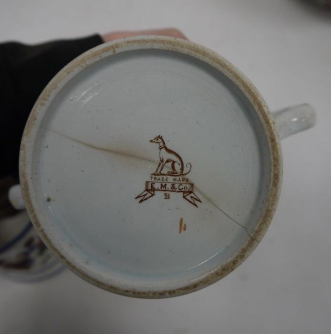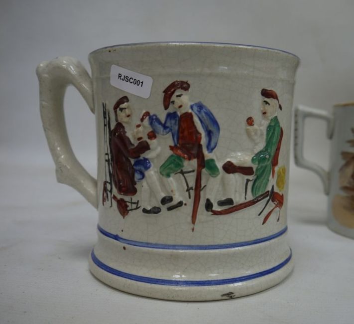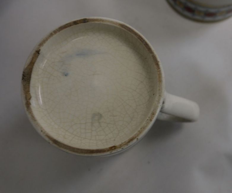 19th century Staffordshire 'Frog' tankard, a two-handled mug, E.M.& Co, two other mugs and a Cauldon jardiniere (5)