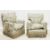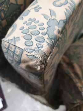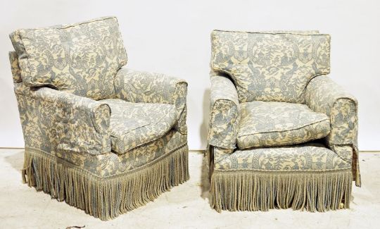 Pair of reproduction armchairs in the manner of Howard and Sons, in white and blue upholstery, on square section tapering front legs terminating to brass castors, rear legs stamped indistinctly 'Howard & Sons, Berners St' and '14865' and all castors marked 'Howard & Sons, London', the other chair with same upholstery and same square section tapering supports to brass castors at the front and marked 'Howard & Sons Ltd, London', the back leg and castors apparently unmarked (2) Condition ReportSome discolouration throughout fabric.. Wear to castors. Some fraying to upholstery edges.