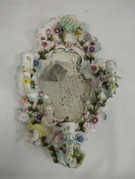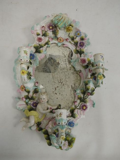19th century porcelain wall mirror with three candle sconces, floral encrusted decoration and relief of cherub, 45cm high
