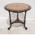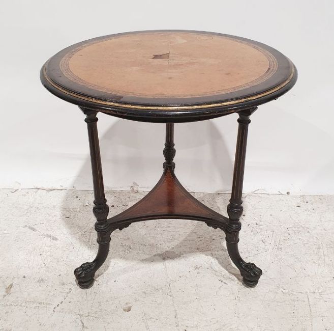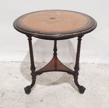 19th century continental ebonised centre table, the circular top with bird's eye maple veneer and decorative inlay, moulded edge, on three turned, fluted and carved supports to triform undertier, on claw feet, 64cm x 64cm