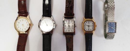 Six assorted lady's and gentleman's modern watches, a sewing machine pendant on chain, a butterfly brooch, etc, in a leather jewellery box